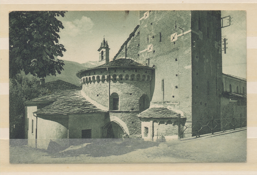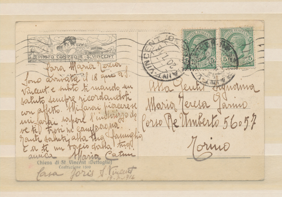 Cartolina chiesa di Saint Vincent viaggiata da Saint Vincent a Torino 1916