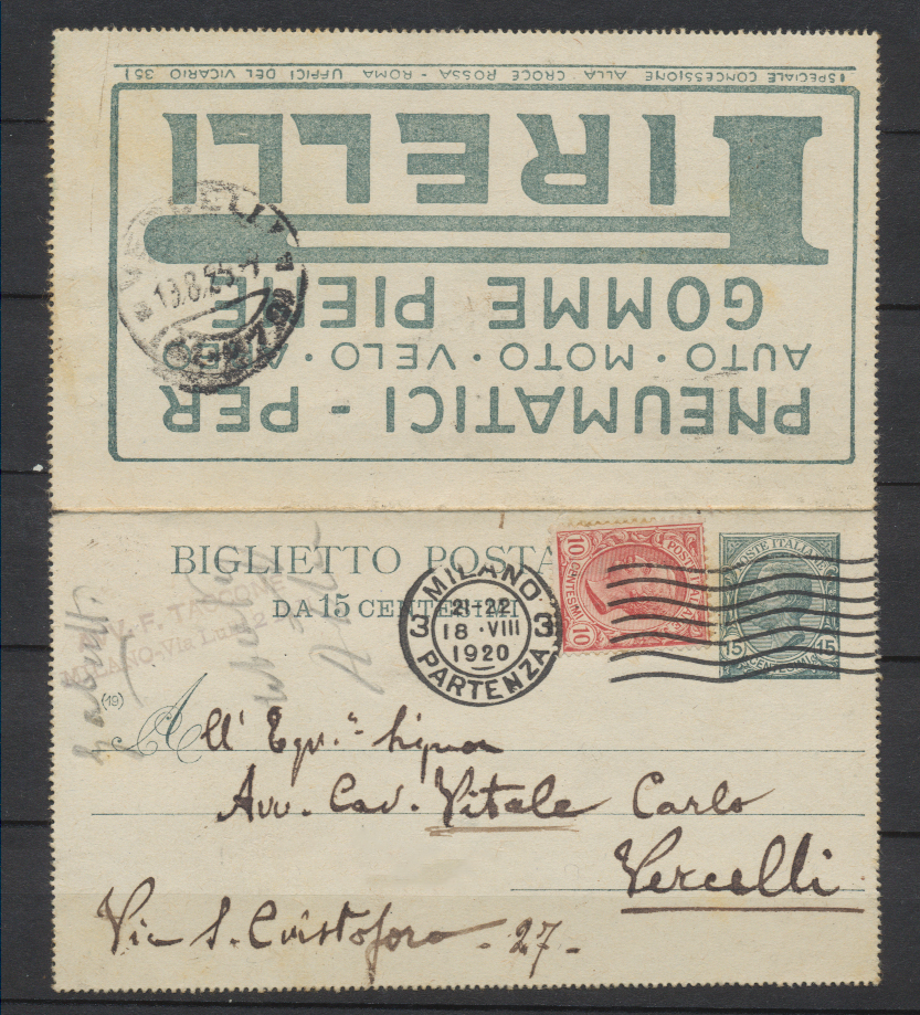 Biglietto Postale Italia Regno 1919 Leoni 15c Tassello Pubblicitario Pirelli Milano Vercelli
