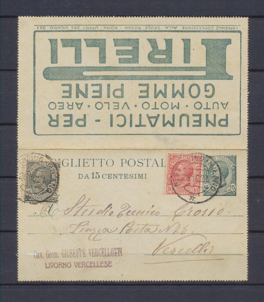 Biglietto Postale Italia Regno 1919 Leoni da 15c Tassello Pubblicitario Pirelli