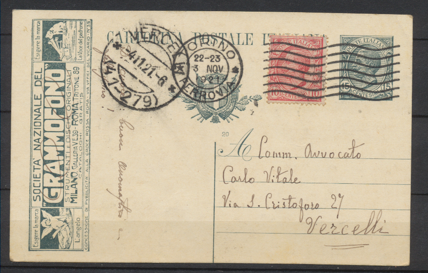 Cartolina Postale Italia Regno 1920 15c Tassello Società Nazionale del Grammofono