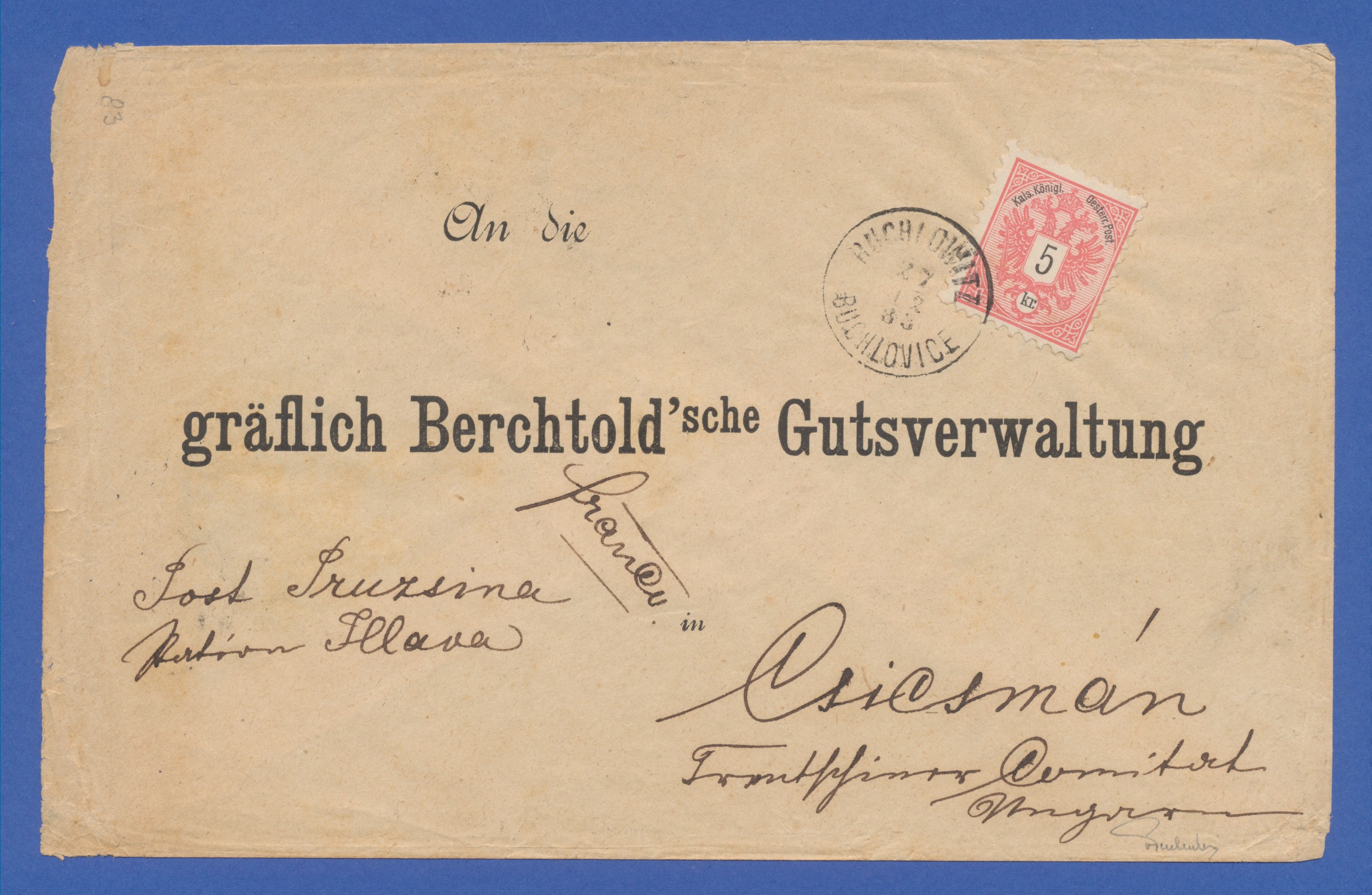 Austria Storia Postale lettera da Buchlowitz (Cz) a Csicsmany (SK) 1883