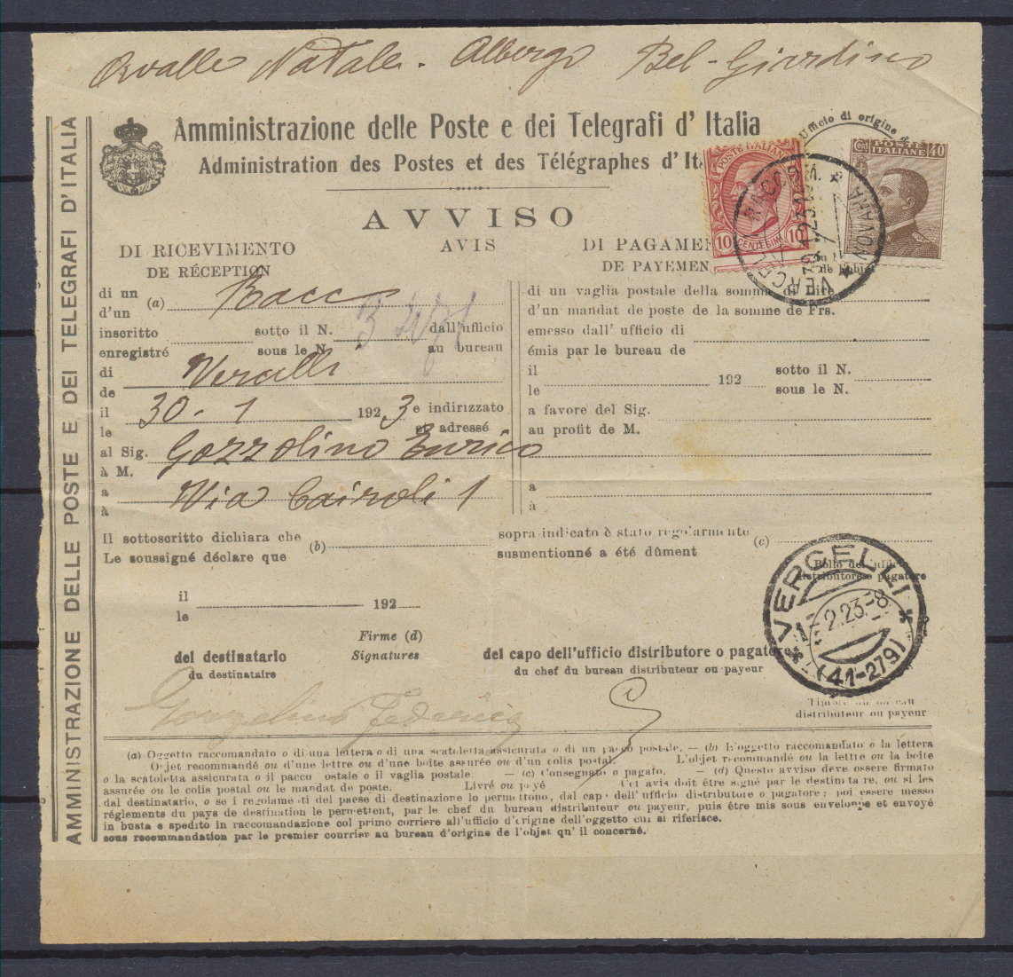 Storia Postale Avviso di Ricevimento Italia Regno 1923 Vercelli