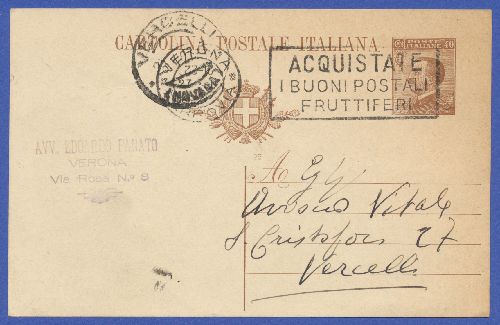 Storia Postale Italia Regno Cartolina postale 40c 1927 da Verona a Vercelli