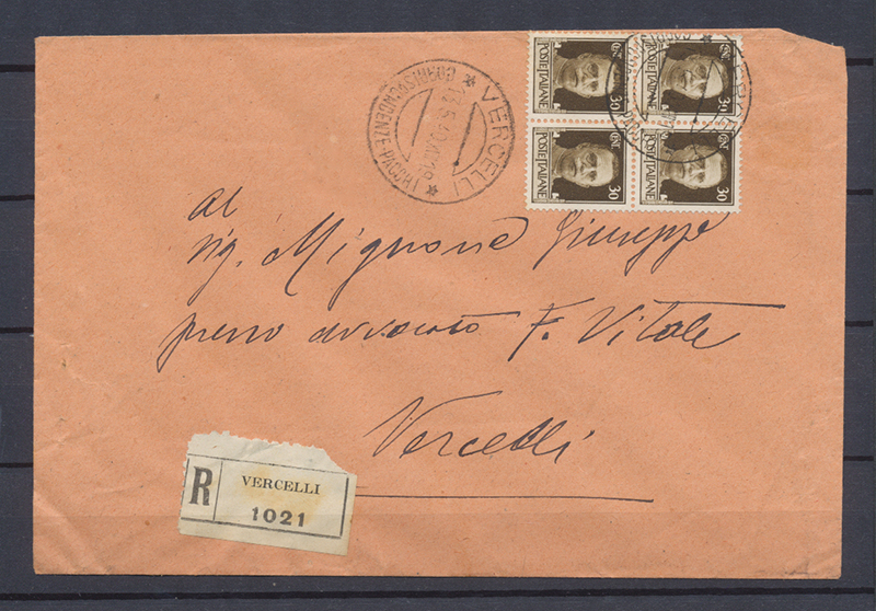 Storia Postale Lettera Raccomandata 1940 Quartina 30c Serie Imperiale da Vercelli a Vercelli