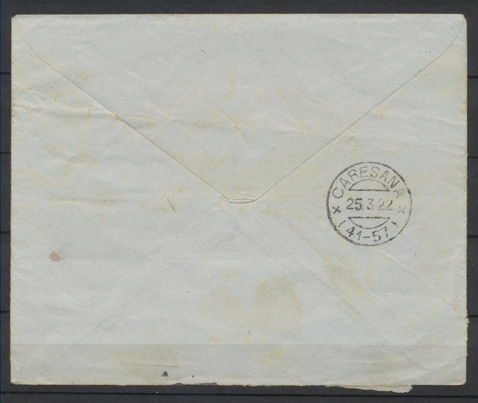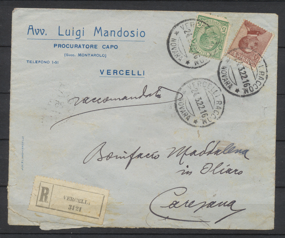 Storia Postale Raccomandata Italia Regno 1922 da Vercelli a Caresana