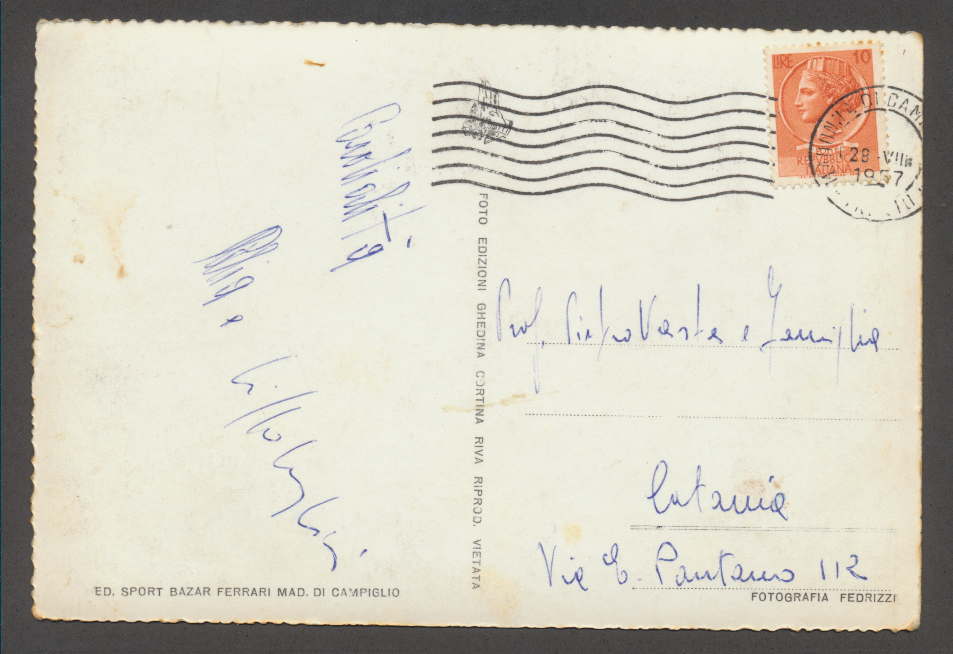Italia Storia Postale Cartolina da Madonna di Campiglio (Tn) a Catania (Ct) 1957