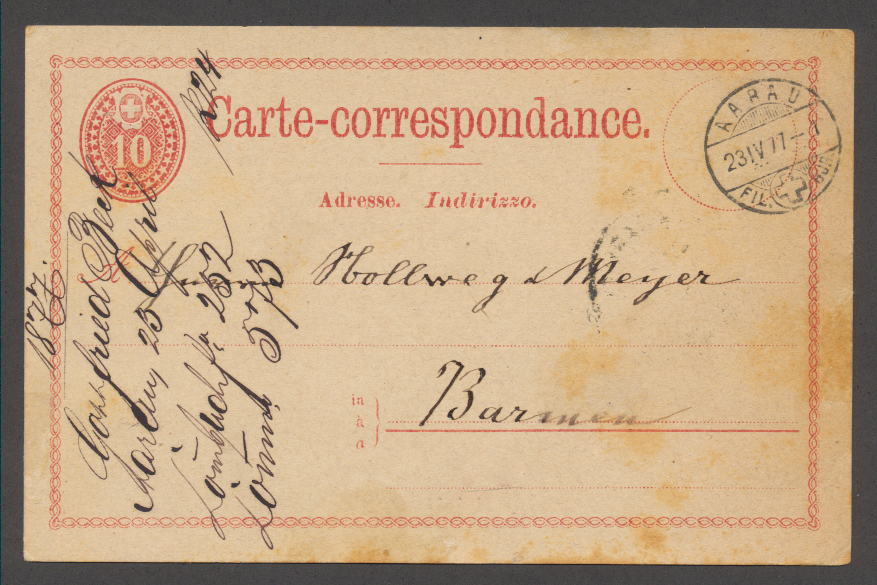 Storia Postale Cartolina Postale da 10c da Aarau a Barmen 1877