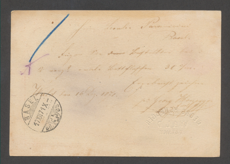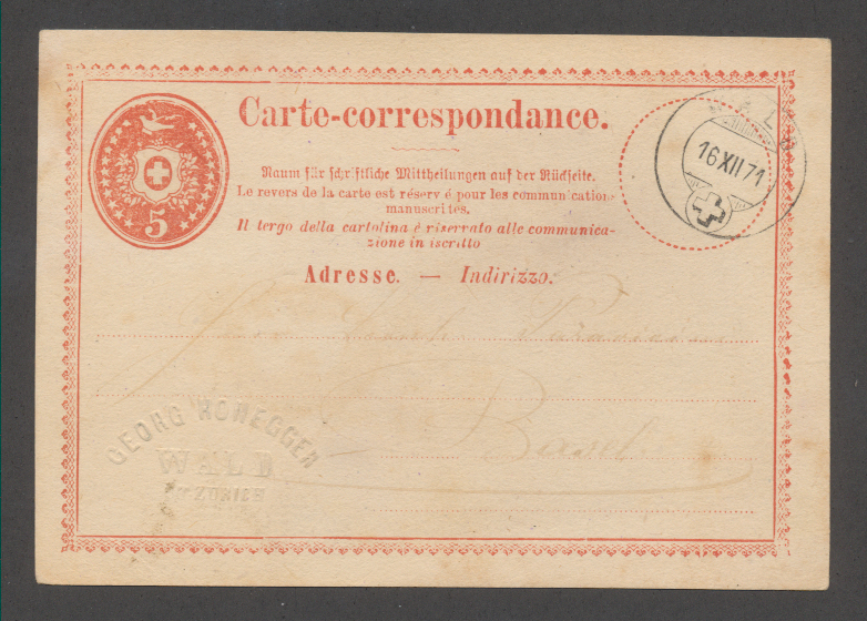 Storia Postale Cartolina Postale da 5c da Wald a Basel 1871