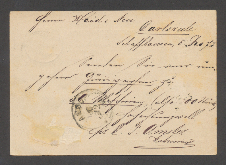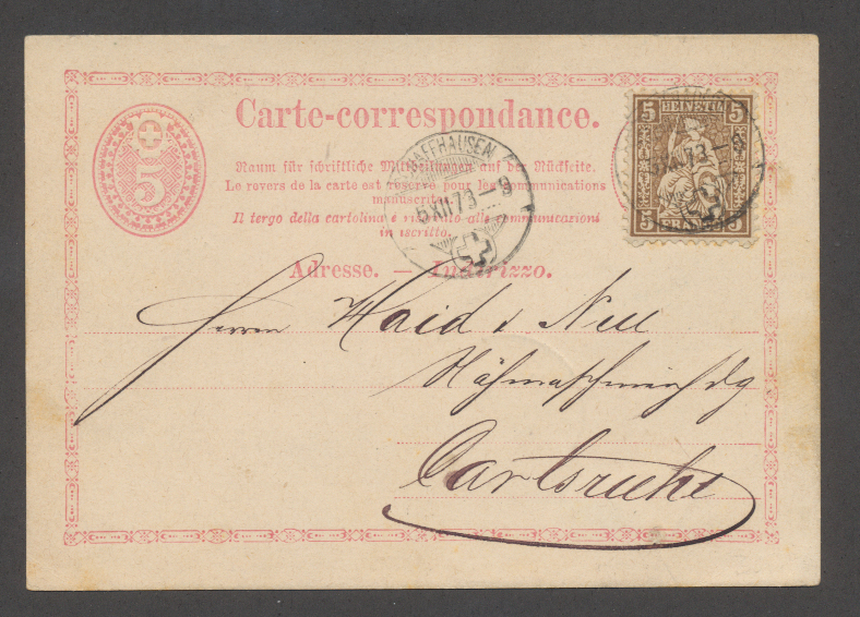 Storia Postale Cartolina Postale da 5c + F. 5c da Schalffhausen a Karlsruhe 1873